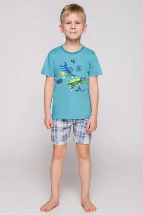 Pyžamo pre chlapcov s krátkym rukávom a kraťasy. Jemné tyrkysové pyžamové tričko s okrúhlym výstrihom má na prednej strane vtipný obrázok dráčikov- dinosauríkov. Pyžamové nohavice sú s celopotlačou - káro. V páse sú do širšej gumy, ktorá však neškrtí.